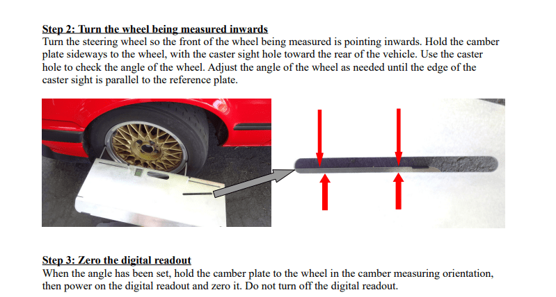 Instructions should not be necessary but: Make sure the checkered board is aligned with the wheel (use a ruler from the edge of the wheel to a line on the board) before you secure it in place, put the arrow on top, turn the wheel until the first of the angled sides lines up with the board, zero out your angle finder, turn the wheel the other way so the other angled side of the arrow lines up, measure the angle of the wheel, multiply by 2 and there’s your caster. BOOM: Headshot. With this, I could get consistent numbers 10 times out of ten!.