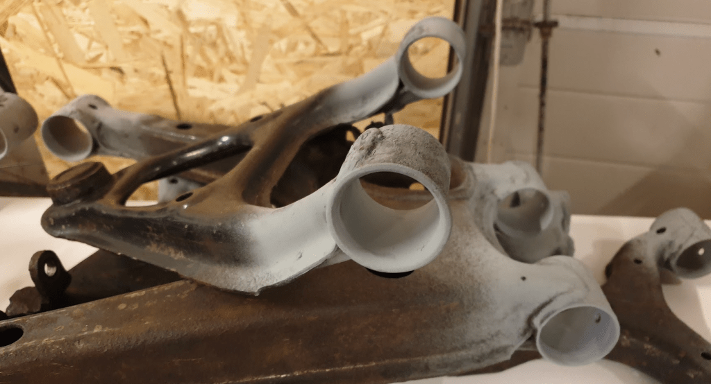 The control arm bushings are actually a piece of piss to get out once you find the hack. Search the web and you and find all sorts of ways to get them out. The blowtorch way burning them seems especially fun and healthy, both for you and the planet – but since our garage is actually part of the house, that idea was dropped like a red headed step child.