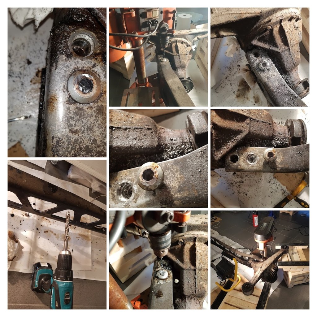 Differential Bushings. Not as much as piece of piss as I only had two to practice on, but once the solution is presented: stupid easy. As with the control arm bushings, many methods are available from Google. Common thing is, get rid of the rubber material, then get to work on the metal shell. Now, since fire is definitely out, I started by drilling as many holes as I could in the rubber. Don’t worry about scratching the metal shell, it’s coming out and going in the trash. Then the trusty jigsaw and went to work (again) on the remaining rubber <I just realized the Marsellus Wallace quote with the pliers and the blow torch would work equally fine here. I’m still not black though>