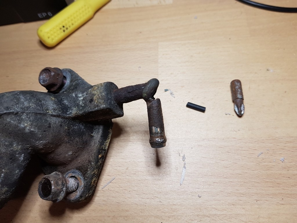 Nothing to do but raise the car again so I can get beneath it and have a quick look. I can see where it’s coming from – the inlet on the water pump distributor thingy (I had to Google that too). So loosen clamp, re-seat, re-tighten, re-try. Same shit. Car up on blocks again, clamps all the way off, hose off. *Looks at inlet pipe*… “That doesn’t look very good”. Out comes the impact gun armed with a 12mm socket. As Adam Savage would’ve would’ve put it: “There’s your problem right there“…. fuck…